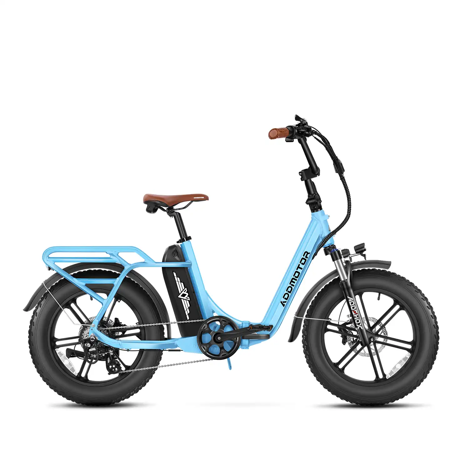 The Addmotor Foldtan M-160 is a premium folding fat-tire electric bike that blends portability, power, and style. Featuring a 750W rear brushless hub motor and a 48V 20Ah built-in Samsung battery, it delivers up to 105 miles per charge (PAS1). Its step-through foldable frame makes it easy to store and transport, while 20x4.0” all-terrain fat tires and a 7-speed transmission ensure smooth rides across city streets, trails, or sandy paths. With hydraulic disc brakes, EB 2.0 lighting, and a torque sensor for natural pedal assist, the M-160 is designed for both convenience and adventure.